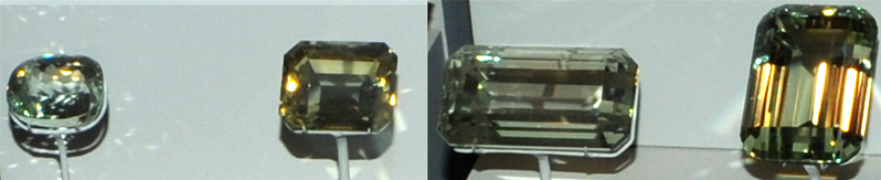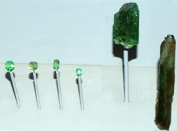 |   | The spodumene gems at left are 0.7,0.4,0.2 and 0.7 carats and are from Stony Point, North Carolina. The mineral samples are from Hiddenite mine, Alexander County, North Carolina. All these samples are of the hiddenite variety. The longest sample is about 5cm.   |