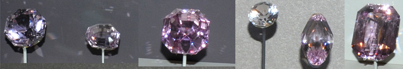 In order to maintain a relative scale, all the above spodumene gem images were patched from the same photograph. The two on the left are 163/9 and 77 carats and are from Nuristan, Afghanistan. The third is 287.8 carats and is from Minas Gerais, Brazil. The fourth and fifth are 60.7 and 170.6 carats and are from Pala, California. The sixth is 266.1 carats and is from Anjanabonoina, Madagascar. All the gems are of the variety kunzite of spodumene.
