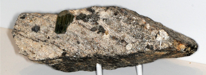 | Spodumene|   | LiAlSi2O9Spodumene is a silicate which contains lithium with composition LiAlSi2O9. This sample is about 35x45 cm and described as spodumene-bearing pegmatite. It is from Long Creek Church, Kings Mountain, North Carolina.  These samples are on display at the Smithsonian Museum of Natural History.  Spodumene is often found in pegmatites, and in fact accounts for one of the largest crystals on record. At the Etta Mine in South Dakota, a spodumene crystal was found which was 42 feet long, 5 feet in diameter and weighed 90 tons!