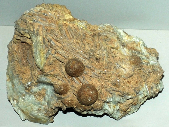 This sample of stokesite is displayed in the Smithsonian Museum of Natural History. Stokesite is a silicate mineral of tin and calcium. It has the composition CaSnSi3O9.2H2O. This sample is about 12x8 cm and is from Galilea, Minas Gerais, Brazil.