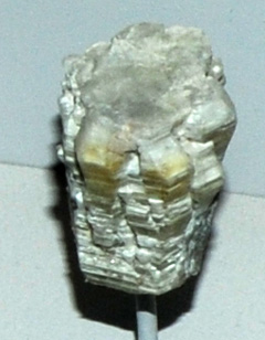 This small sample of Weloganite is displayed in the Smithsonian Museum of Natural History. Weloganite is a carbonate mineral which contains strontium and zirconium with the composition Na2(Sr,Ca)3Zr(CO3)6.3H2O. This sample is about 1.5x2 cm and originated in Francon Quarry, Montreal, Quebec, Canada.