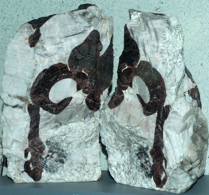 This sample of zincite is displayed in the Smithsonian Museum of Natural History. Zincite is an oxide of zinc with manganese and iron. It has the general composition (Zn,Mn,Fe)O. This sample is described as zincite with calcite and is from Sterling Hill Mine, Ogdensburg, New Jersey. The two samples together are about 18 cm wide. Their content is labeled as (Zn,Mn)O.