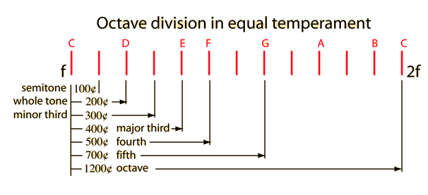 Musical intervals are often expressed in cents, a unit of pitch based upon the equal tempered octave such that one equal tempered semitone is equal to 100 cents. An octave is then 1200¢ and the other equal tempered intervals can be obtained by adding semitones: