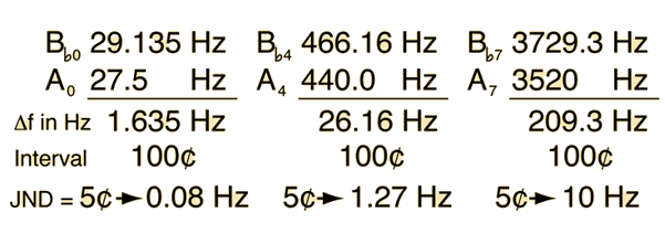 Included with the semitone intervals above is an evaluation of the deviation in Hz needed to equal 5¢, the nominal just-noticeable difference for these pitches. Note that the range represented by 5¢ increases from less than a tenth of a Hz at the low end of the piano to about 10 Hz at the top end of the piano.