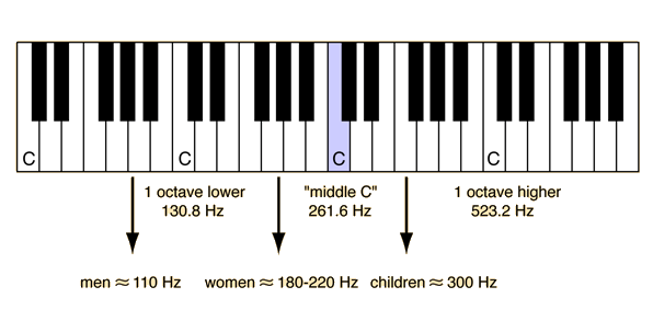 In an adult male, the vocal folds are usually 17-23 mm long, and12.5 -17 mm in an adult female (Kaplan). They may be stretched 3 or 4 mm by action of the muscles in the larynx. The male speaking voice averages about 125 Hz, while the female voice averages about 210 Hz. Children's voices average over 300 Hz. The illustration below shows approximate pitches for speaking voices related to an equal tempered piano keyboard based on A4 = 440 Hz. ![]() The front end of the vocal folds is attached to the thyroid cartilage, the "Adam's apple". The back end is attached to the arytenoid cartilages, which move to separate the folds for breathing. |