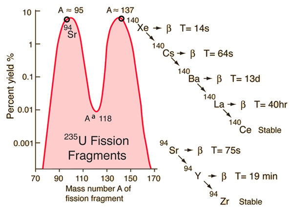 Fission Fragment DecayThis particular set of fragments from uranium-235 fission undergoes a series of beta decays to form stable end products. ![]() |