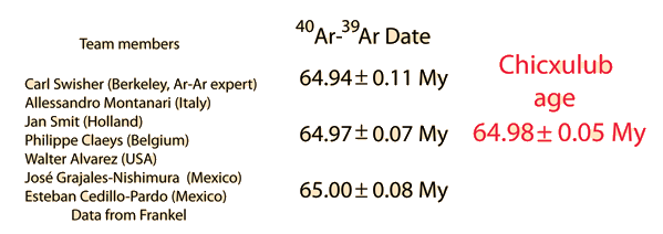 Argon-Argon Dating and the Chicxulub ImpactIn the early 1990s there was an intense controversy about the association of the Chicxulub Crater of the Mexican Yucatan Peninsula with the extinction of the dinosaurs in the period about 65 million years ago. The Cretaceous-Tertiary boundary in the geological age scale was associated with an iridium-rich layer which suggested that the layer was caused by an impact with an extraterrestrial object. Because that time period, commonly referred to as the K-T boundary, was associated with the extinction of vast numbers of animals in the fossil record, much effort was devoted to dating it with potassium-argon and other methods of geochronology. The time of 65 million years was associated with the K-T boundary from these studies. Other large impact craters such as the Manson crater in Iowa (dated to 74 My) were examined carefully as candidates for the cause of the extinction, but none were close to the critical time. Chicxulub was not so obvious as a candidate because much of the evidence for it was under the sea. More attention was directed to the Yucatan location after published work by Alan Hildebrand in 1991 demonstrated the chemical similarity of Chicxulub core samples with material found distributed in the K-T boundary layer. Carl Swisher organized a team to produce three independent measurements of the age of intact glass beads from the C-1 core drill site in the Chicxulub impact area. The measurements were done by the argon-argon method. ![]() Even this extraordinary matching with the age of the K-T boundary was insufficient to convince many geologists. The team proceeded to date spherules of glass found in Haiti to provide another bit of evidence. Many pieces of glass ejecta had been found on Haiti, which is over a thousand miles from the impact point currently. But geologists project a much smaller distance between the points at the time of the impact because of measured sea floor expansion. The Haitian spherules were measured to have age to melting of 65.01 +/- 0.08 My, in extraordinary agreement with the measured ages of the core samples. A third piece of evidence came from age measurements of shocked zircon crystals which were found in the K-T layer as far away as Colorado and Saskatchewan. Zircon has sometimes produced puzzles in radiometric dating because its melting temperature is so high that the crystals sometimes survive in hot melted minerals, giving different melt dates than the other minerals surrounding them. But in this case the nature of zircon was an advantage. The shocked crystals were partially melted, and when measured by the uranium-lead method method gave two ages, 65 My and 545 My. Since the crustal basement in the Yucatan area was known to have an age in the neighborhood of the older age, this gave some confirmation to the Chicxulub crater as the origin of the K-T boundary layer. According to Frankel, this was the step that had most geologists convinced by 1994 that this impact was the source of the iridium-rich K-T boundary deposit and the extinction of the dinosaurs.