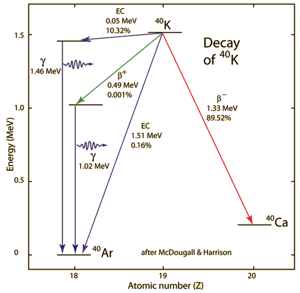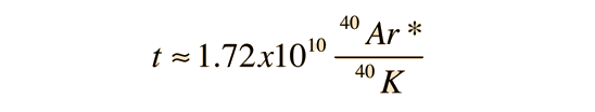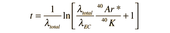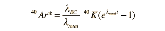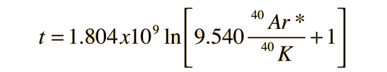 ![]() Even though the decay of 40K is somewhat complex with the decay to 40Ca and three pathways to 40Ar, Dalrymple and Lanphere point out that potassium-argon dating was being used to address significant geological problems by the mid 1950's. The energy-level diagram below is based on data accumulated by McDougall and Harrison. ![]() For a radioactive decay which produces a single final product, the decay time can be calculated from the amounts of the parent and daughter product by ![]() where N0 and N are the initial and final numbers of the parent isotope, λ is the decay constant and T is the half-life. But the decay of potassium-40 has multiple pathways, and detailed information about each of these pathways is necessary if potassiun-argon decay is to be used as a clock. This information is typically expressed in terms of the decay constants. The measured amount of radiogenic 40Ar* in terms of the current measured amount of 40K can be expressed as ![]() This can be solved for the time t ![]() When the values for the decay constants in the table above are used, the expression for the radiometric age becomes ![]() Here, it is useful to make use of the series representation of ln(x+1), which may be approximated by x if x<< 1: ![]() Since the population of 40Ar* is usually quite small, the approximation of ln(x+1)≈x gives ![]() Geyh & Schleicher comment that the above approximation results in only 1% error at 107 years. * The asterisk in 40Ar* is a reminder that a valid date is obtained only if all the argon-40 is of radiogenic origin in that particular sample. The assumptions made are
