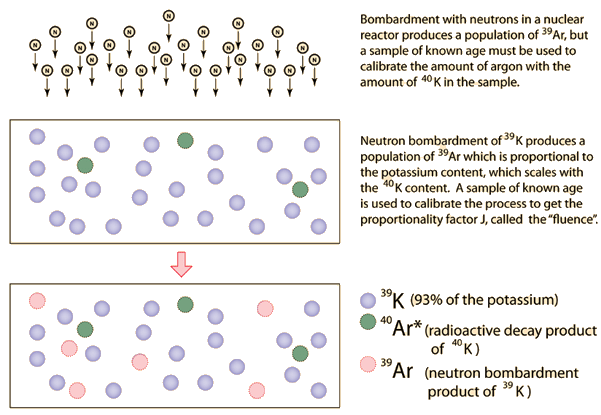 Dating with 39Ar and 40Ar depends upon the fact that the 39K can be bombarded with neutrons in a nuclear reactor to produce an amount of 39Ar which is proportional to the potassium content of the sample. By then comparing the population of 39Ar and 40Ar* atoms in a single sample, you can compute a 40Ar*/40K ratio and thus an age for the sample. The conventional potassium-argon dating process is technically difficult and usually is carried out by analyzing for potassium in one part of the sample and measuring 40Ar in another. The Ar-Ar process can be done on the same small piece of a sample, analyzing for both gases in a mass spectrometer.