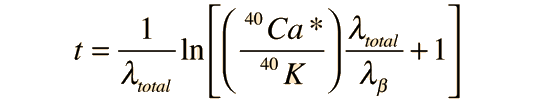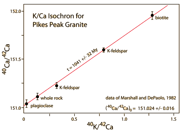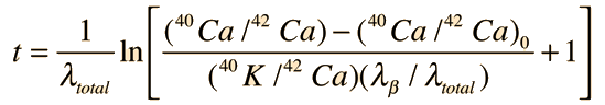Following the standard approach for decays by multiple pathways, the expression for the age from the radiogenic 40Ca can be written ![]() Using non-radiogenic 42Ca for comparison, the equation for an isochron can be developed. ![]() The slope of the isochron line gives a measure of the radiometric age. ![]() Geyh and Schleicher cite this example and compare to a Rb-Sr isochron age of 1008 +/13 My from Barker, et al in 1976.