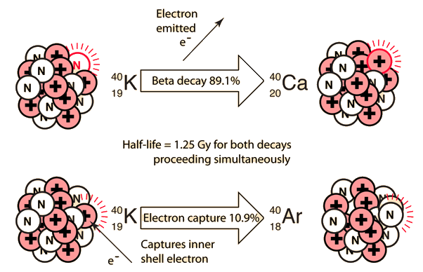 Potassium-Argon DatingPotassium-Argon dating has the advantage that the argon is an inert gas that does not react chemically and would not be expected to be included in the solidification of a rock, so any found inside a rock is very likely the result of radioactive decay of potassium. Since the argon will escape if the rock is melted, the dates obtained are to the last molten time for the rock. Since potassium is a constituent of many common minerals and occurs with a tiny fraction of radioactive potassium-40, it finds wide application in the dating of mineral deposits. The feldspars are the most abundant minerals on the Earth, and potassium is a constituent of orthoclase, one common form of feldspar.