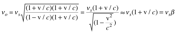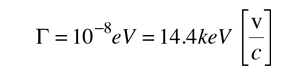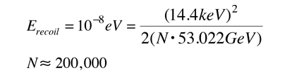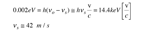 This is five orders of magnitude greater than the natural linewidth of the iron transition which produced the photon. This recoil energy reduces the photon energy by this amount as seen by a potential absorbing nucleus at rest. To get resonance absorption, you have two options: nail down the nucleus in a crystal lattice so that it has almost no recoil, or move the source and absorber relative to each other so that the Doppler shift of the photon moves it to the necessary energy for absorption. The Doppler shift of a photon is a relativistic Doppler shift given by  If v/c<<1 then this may be simplified by   While this is possible, and was done with centrifuge tips, there is generally a better way. Mossbauer found that if he cooled the emitter, you could reach a condition where the emitting nucleus could not recoil by itself. Qualitatively, the reason is that at sufficiently low temperatures an atom in a crystal lattice cannot recoil individually. The quantization of the vibrational states of the lattice causes the energy of recoil to be absorbed by the lattice as a whole. It was a great breakthrough to realize that you could get resonance absorption of gamma rays by putting the source nuclei in a crystal and cooling it. To see how many iron nuclei would have to recoil together to keep the gamma within the natural linewidth:  Compared to Avogadro's number, that's not very many. In fact, it is a speck of matter too small to be seen in an optical microscope. It would follow that any tiny crystal within a cobalt-57-containing piece of iron would meet the conditions for resonance absorption if cooled sufficiently. It was established that you can produce resonant gamma absorption by cooling the iron sample. You can also destroy that resonance by moving the source relative to the absorber. Returning to the Doppler expression  gives v=0.0002 m/s to produce enough Doppler shift of the emitted gamma to detune the resonant absorption. This is more than a curiosity-- this is the basis for an incredibly sensitive instrument. Pound and Rebka needed just such an instrument to test the gravitational red shift.