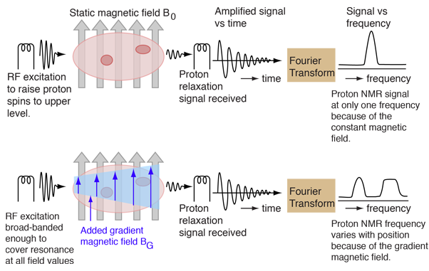 The schematic below may help visualize the imaging process. It is presumed that there are two regions of the sample which contain enough hydrogens to produce a strong NMR signal. The top sketch visualizes an NMR process with a constant magnetic field applied to the entire sample. The hydrogen spin-flip frequency is then the same for all parts of the sample. Once excited by the RF signal, the hydrogens will tend to return to their lower state in a process called "relaxation" and will re-emit RF radiation at their Larmor frequency. This signal is detected as a function of time, and then is converted to signal strength as a function of frequency by means of a Fourier transformation. Since the protons in each of the active areas of the sample are subjected to the same magnetic field, they will produce the same frequency of radiation and the Fourier transform of the detected signal will have only one peak. This one peak demonstrates the presence of hydrogen atoms, but gives no information to locate them in the sample.  Information about the location of the hydrogen atoms can be obtained by adding a calibrated gradient field across the region of the sample as shown in the bottom sketch above. With an increasing magnetic field as you move to the right across the sample, the spin-flip energy and therefore the frequency of the emitted signal increases from left to right. When excited by an RF transmitter, the emitted signal contains different frequencies for the two proton concentration areas. These frequencies can be separated by means of the Fourier transform and the example gives two different regions of frequency for the two sample areas. This is the beginning of the process of locating the hydrogen atoms. In the sketch, it only locates them along the horizontal direction, giving no indication that they are at different heights.