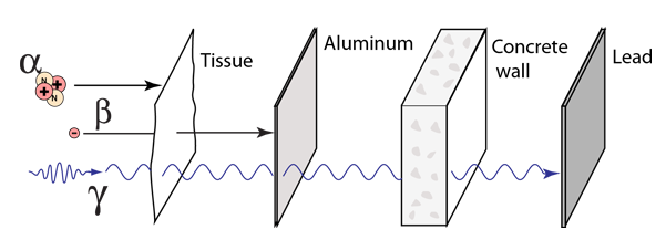 Penetration of MatterThough the most massive and most energetic of radioactive emissions, the alpha particle is the shortest in range because of its strong interaction with matter. The electromagnetic gamma ray is extremely penetrating, even penetrating considerable thicknesses of concrete. The electron of beta radioactivity strongly interacts with matter and has a short range. ![]() |