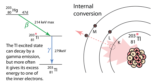 Internal ConversionInternal conversion is another electromagnetic process which can occur in the nucleus and which competes with gamma emission. Sometimes the multipole electric fields of the nucleus interact with orbital electrons with enough energy to eject them from the atom. This process is not the same as emitting a gamma ray which knocks an electron out of the atom. It is also not the same as beta decay, since the emitted electron was previously one of the orbital electrons, whereas the electron in beta decay is produced by the decay of a neutron. ![]() An example used by Krane is that of 203Hg, which decays to 203Tl by beta emission, leaving the 203Tl in an electromagnetically excited state. It can proceed to the ground state by emitting a 279.190 keV gamma ray, or by internal conversion. In this case the internal conversion is more probable. Since the internal conversion process can interact with any of the orbital electrons, the result is a spectrum of internal conversion electrons which will be seen as superimposed upon the electron energy spectrum of the beta emission. The energy yield of this electromagnetic transition can be taken as 279.190 keV, so the ejected electrons will have that energy minus their binding energy in the 203Tl daughter atom. The diagram above is of course conceptual only and not to scale since the nuclear radius of thallium is modeled to be about 0.7x10-14 m and the radius of the atom is about 1.76x10-10m, a factor of about 25,000 larger! And of course the planetary type orbits of the electrons are unrealistic since the wave properties of the electrons lead to charge distributions that give a finite probability that the K electron shown above will actually extend inside the nucleus so that the nucleus can interact with it and hand off its excess energy. An examination of the electron distribution for the simplest atom, hydrogen, can give the perspective that the electron has a small but finite probability of extending into the nucleus. From the table of binding energies below, you can see that the binding energy of the K-shell electron is over 85,000 electron volts compared to 13.6 eV for the hydrogen electron, or over 6,000 times larger.