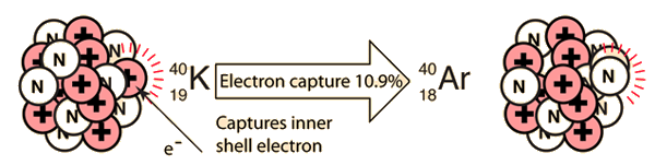 In the middle range of the periodic table, those isotopes which are lighter than the most stable isotopes tend to decay by electron capture, and those heavier decay by negative beta decay. An example of this pattern is seen with silver isotopes, with two stable isotopes plus one of lower mass which decays by electron capture and one of heavier mass which decays by beta emission. An important example of electron capture decay is that of potassium-40 since it forms the basis for the potassium-argon mineral dating process. ![]()