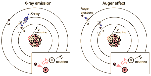 The capture of the electron by a proton in the nucleus is accompanied by the emission of a neutrino. The process leaves a vacancy in the electron energy level from which the electron came, and that vacancy is either filled by the dropping down of a higher-level electron with the emission of an X-ray or by the ejection of an outer electron in a process called the Auger effect. ![]()