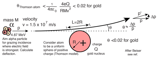 Alpha Scattering by Charge CloudThe Rutherford scattering experiment put to rest the Thomson model of the atom, because it could be shown that a positive charge distributed throughout the classical volume of the atom could not deflect the alpha particles by more than a small fraction of a degree. ![]() The calculation of an upper bound on the change in momentum Δp for the alpha particle can be approached in terms of the impulse of force relationship FΔt = Δp. Making use of the Coulomb force expression: ![]() For the specific case of the 4.87 MeV alpha particle from radium-226, this estimate of the angle becomes ![]() This calculation uses the radius 0.179 nm for the gold atom from the periodic table. It also includes the following velocity for the alpha particle calculated from the non-relativistic kinetic energy expression. ![]() The insight gained by Rutherford and his research team, including Geiger and Marsden, was that the current picture of the atomic volume as being filled with positively charged matter could not be correct since they saw alpha deflections of more than 90°. It also told them that with radii much smaller than the atom, they could get large deflections. So this table-top experiment gave birth to the picture of the atomic nucleus as a small central core of positively charged matter, and the reasoning followed from strictly classical physics. |