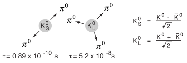 Cronin and Fitch Experiment with KaonsIn the study of neutral kaons, two particle species were found, having apparently identical masses but very different lifetimes. These particles have different decay modes. ![]() In 1964, Cronin and Fitch performed a beam experiment in which they measured the decay of pions at the end of a 57 foot beamline. Given the disparity of the lifetimes of the two kaon species, you expect to see only the long-lived version at the end of the beam tube, but they found about 1 in 500 decays to be 2-pion decays, characteristic of the short-lived species. ![]() The short-lived particle should not be observable more than a few centimeters down the beam line. To show that, suppose we calculate the time required to drop to 1/500 the original population. With the stated lifetime, the halflife calculation gives a time of 5.5 x 10-10 seconds. At nearly the speed of light, this would give a distance of about 17 centimeters, only 1/100 the length of Cronin and Fitch's beam tube. The problem with this number is that it ignores relativistic time dilation, and the lifetime as seen in the laboratory frame is dilated by the relativity factor γ (at 0.98c, γ =5). The revised distance is then 17γ cm, so even at 0.98c the population would be down by a factor of 500 by the time you got a meter down the beam tube. So for any expected particle velocity, you would expect all of them to have decayed long before you get to the end of the beam line. This experiment showed that there was a small CP violation in the kaon decay, so the kaon has played a central role in the discussions of these symmetries since that time.