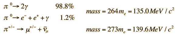 The neutral pion decays to two photons (gamma rays) 98.8% of the time. The decay is by the electromagnetic interaction on a time scale of about 10-16 seconds. The positive and negative pions have longer lifetimes of about 2.6 x 10-8 s. ![]() The negative pion decays into a muon and a muon antineutrino as illustrated below. This decay is puzzling upon first examination because the decay into an electron plus an electron antineutrino yields much more energy. Usually the pathway with the greatest energy yield is the preferred pathway. This suggests that some symmetry is acting to inhibit the electron decay pathway. ![]() The symmetry which suppresses the electron pathway is that of angular momentum, as described by Griffiths. Since the negative pion has spin zero, the electron and antineutrino must be emitted with opposite spins to preserve net zero spin. But the antineutrino is always right-handed, so this implies that the electron must be emitted with spin in the direction of its linear momentum (i.e., also right-handed). But if the electron were massless, it would (like the neutrino) only exist as a left-handed particle, and the electron pathway would be completely prohibited. So the suppression of the electron pathway is attributed to the fact that the electron's small mass greatly favors the left-handed symmetry, thus inhibiting the decay. Weak interaction theory predicts that the fraction of muons decaying into electrons should be 1.28 x 10-4 and the measured branching ratio is 1.23 +/- 0.02 x 10-4. Being composed of an up and an antidown quark, the positive pion would be expected to have a mass about 2/3 that of a proton, yet its mass is only about 1/6 of that of the proton! This is an example of how hadron masses depend upon the dynamics inside the particle, and not just upon the quarks contained.