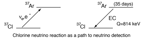 The Solar Neutrino TelescopeRaymond Davis of Brookhaven National Laboratory constructed a neutrino detector 1.6 km underground in the Homestake Gold Mine in Lead, South Dakota. The detector consists of a 378,000 liter tank of perchloroethylene, which is further isolated by being submerged in water. Theoretical expections were about one neutrino-chlorine interaction per day, but the measured solar neutrino events were about a third of that, raising serious questions about the abundance of solar neutrinos (the Solar Neutrino Problem). The detection of neutrinos by this instrument was based on the interaction of neutrinos with chlorine nuclei to produce argon. The argon can be removed from the tank and measured so that the number of neutrinos captured in a given time interval can be determined. ![]() The argon decays back to the chlorine isotope from which it was created by the process of electron capture. The detection of this transition is aided by the definite energy of the x-ray emitted during the electron capture process. This mine experiment was able to detect about 15 argon atoms a month, according to Simpson.