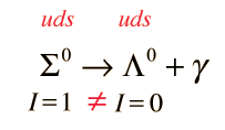 which does not involve any transmutation of quarks, so would be expected to decay by strong interaction. However, it does not conserve isospin, and is observed to decay by the electromagnetic interaction, but not by the strong interaction. The experimental discrimination is made by the observation of its decay lifetime, presuming by the totalitarian principle that if it could decay by the strong interaction, it would.