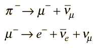 The first reaction above (decay of the pion) is known to be a two-body decay by the fact that a well-defined muon energy is observed from the decay. However, the decay of the muon into an electron produces a distribution of electron energies, showing that it is at least a three-body decay. In order for both electron lepton number and muon lepton number to be conserved, then the other particles must be an electron anti-neutrino and a muon neutrino.