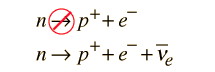 The first significant example was found in the decay of the neutron. When the decay of the neutron into a proton and an electron was observed, it did not fit the pattern of two-particle decay. That is, the electron emitted does not have a definite energy as is required by conservation of energy and momentum for a two-body decay. This implied the emission of a third particle, which we now identify as the electron antineutrino.