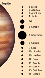 Montage of Jupiter and the Galilean satellites Io, Europa, Ganymede and Callisto. The images are not to scale, but are in their relative positions. At upper left, the reddish Io is nearest Jupiter. Then Europa in center, then Ganymede and Callisto at the lower right. Image credit NASA, Jet Propulsion Laboratory. These images are from Voyager I. |   | * Indicates retrograde orbit.| Name | Distance from Jupiter | Orbit Period | Size |  | 106 m | Jupiter radii | (days) | (Longest diameter, km)