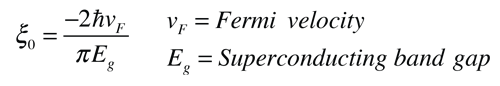 Coherence Length in SuperconductorsOne of the characteristic lengths for the description of superconductors is called the coherence length. It is related to the Fermi velocity for the material and the energy gap associated with the condensation to the superconducting state. It has to do with the fact that the superconducting electron density cannot change quickly - there is a minimum length over which a given change can be made, lest it destroy the superconducting state. For example, a transition from the superconducting state to a normal state will have a transition layer of finite thickness which is related to the coherence length. ![]() |
