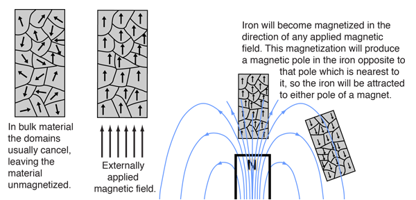 FerromagnetismIron, nickel, cobalt and some of the rare earths (gadolinium, dysprosium) exhibit a unique magnetic behavior which is called ferromagnetism because iron (ferrum in Latin) is the most common and most dramatic example. Samarium and neodymium in alloys with cobalt have been used to fabricate very strong rare-earth magnets. Ferromagnetic materials exhibit a long-range ordering phenomenon at the atomic level which causes the unpaired electron spins to line up parallel with each other in a region called a domain. Within the domain, the magnetic field is intense, but in a bulk sample the material will usually be unmagnetized because the many domains will themselves be randomly oriented with respect to one another. Ferromagnetism manifests itself in the fact that a small externally imposed magnetic field, say from a solenoid, can cause the magnetic domains to line up with each other and the material is said to be magnetized. The driving magnetic field will then be increased by a large factor which is usually expressed as a relative permeability for the material. There are many practical applications of ferromagnetic materials, such as the electromagnet. Ferromagnets will tend to stay magnetized to some extent after being subjected to an external magnetic field. This tendency to "remember their magnetic history" is called hysteresis. The fraction of the saturation magnetization which is retained when the driving field is removed is called the remanence of the material, and is an important factor in permanent magnets. All ferromagnets have a maximum temperature where the ferromagnetic property disappears as a result of thermal agitation. This temperature is called the Curie temperature. Ferromagntic materials will respond mechanically to an impressed magnetic field, changing length slightly in the direction of the applied field. This property, called magnetostriction, leads to the familiar hum of transformers as they respond mechanically to 60 Hz AC voltages.