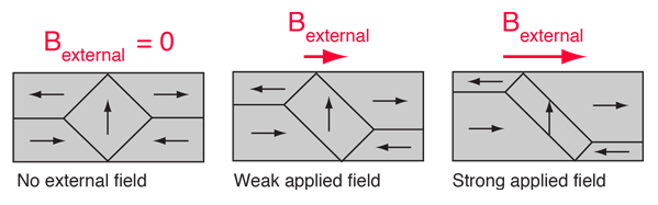 Magnetic DomainsThe microscopic ordering of electron spins characteristic of ferromagnetic materials leads to the formation of regions of magnetic alignment called domains. ![]() The main implication of the domains is that there is already a high degree of magnetization in ferromagnetic materials within individual domains, but that in the absence of external magnetic fields those domains are randomly oriented. A modest applied magnetic field can cause a larger degree of alignment of the magnetic moments with the external field, giving a large multiplication of the applied field. These illustrations of domains are conceptual only and not meant to give an accurate scale of the size or shape of domains. The microscopic evidence about magnetization indicates that the net magnetization of ferromagnetic materials in response to an external magnetic field may actually occur more by the growth of the domains parallel to the applied field at the expense of other domains rather than the reorientation of the domains themselves as implied in the sketch. ![]() Some of the more direct evidence we have about domains comes from imaging of domains in single crystals of ferromagnetic materials. The sketches above are after Young and are adapted from magnified images of domain boundaries in single crystals of nickel. They suggest that the effect of external magnetic fields is to cause the domain boundaries to shift in favor of those domains which are parallel to the applied field. It is not clear how this applies to bulk magnetic materials which are polycrystalline. Keep in mind the fact that the internal magnetic fields which come from the long range ordering of the electron spins are much stronger, sometimes hundreds of times stronger, than the external magnetic fields required to produce these changes in domain alignment. The effective multiplication of the external field which can be achieved by the alignment of the domains is often expressed in terms of the relative permeability. Domains may be made visible with the use of magnetic colloidal suspensions which concentrate along the domain boundaries. The domain boundaries can be imaged by polarized light, and also with the use of electron diffraction. Observation of domain boundary movement under the influence of applied magnetic fields has aided in the development of theoretical treatments. It has been demonstrated that the formation of domains minimizes the magnetic contribution to the free energy. |