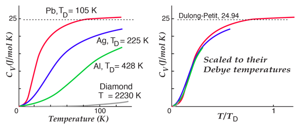 Since the Debye specific heat expression can be evaluated as a function of temperature and gives a theoretical curve which has a specific form as a funtion of T/TD, the specific heats of different substances should overlap if plotted as a function of this ratio. At left below, the specific heats of four substances are plotted as a function of temperature and they look very different. But if they are scaled to T/TD, they look very similar and are very close to the Debye theory. ![]()