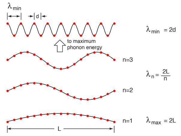What is a Phonon?Considering the regular lattice of atoms in a uniform solid material, you would expect there to be energy associated with the vibrations of these atoms. But they are tied together with bonds, so they can't vibrate independently. The vibrations take the form of collective modes which propagate through the material. Such propagating lattice vibrations can be considered to be sound waves, and their propagation speed is the speed of sound in the material. The vibrational energies of molecules, e.g., a diatomic molecule, are quantized and treated as quantum harmonic oscillators. Quantum harmonic oscillators have equally spaced energy levels with separation ΔE = hυ. So the oscillators can accept or lose energy only in discrete units of energy hυ. The evidence on the behavior of vibrational energy in periodic solids is that the collective vibrational modes can accept energy only in discrete amounts, and these quanta of energy have been labeled "phonons". Like the photons of electromagnetic energy, they obey Bose-Einstein statistics. Considering a solid to be a periodic array of mass points, there are constraints on both the minimum and maximum wavelength associated with a vibrational mode. ![]()