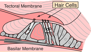 filled tympanic and vestibular canals. There are some 16,000 -20,000 of the hair cells distributed along the basilar membrane which follows the spiral of the cochlea.