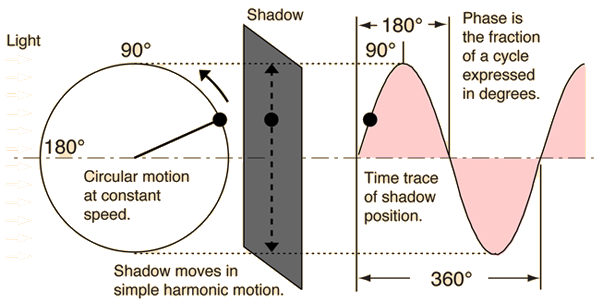 PhaseIf a mass on a rod is rotated at constant speed and the resulting circular path illuminated from the edge, its shadow will trace out simple harmonic motion. If the shadow vertical position is traced as a function of time, it will trace out a sine wave. A full period of the sine wave will correspond to a complete circle or 360 degrees. The idea of phase follows this parallel, with any fraction of a period related to the corresponding fraction of a circle in degrees. ![]() |