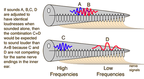 Adding LoudnessWhen one sound is produced and another sound is added, the increase in loudness perceived depends upon its frequency relative to the first sound. Insight into this process can be obtained from the place theory of pitch perception. If the second sound is widely separated in pitch from the first, then they do not compete for the same nerve endings on the basilar membrane of the inner ear. Adding a second sound of equal loudness yields a total sound about twice as loud. But if the two sounds are close together in frequency, within a critical band, then the saturation effects in the organ of Corti are such that the perceived combined loudness is only slightly greater than either sound alone. This is the condition which leads to the commonly used rule of thumb for loudness addition. ![]() |