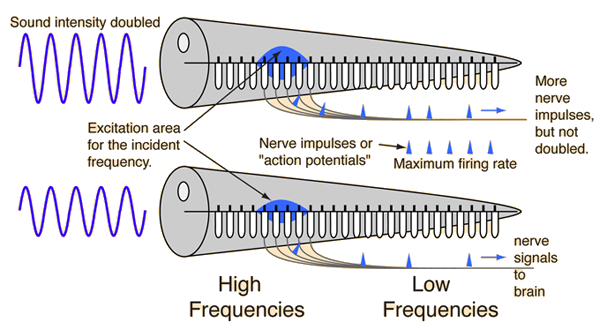 "Rule of Thumb" for LoudnessA widely used "rule of thumb" for the loudness of a particular sound is that the sound must be increased in intensity by a factor of ten for the sound to be perceived as twice as loud. A common way of stating it is that it takes 10 violins to sound twice as loud as one violin. Another way to state the rule is to say that the loudness doubles for every 10 phon increase in the sound loudness level. Although this rule is widely used, it must be emphasized that it is an approximate general statement based upon a great deal of investigation of average human hearing but it is not to be taken as a hard and fast rule. ![]() Why is it that doubling the sound intensity to the ear does not produce a dramatic increase in loudness? We cannot give answers with complete confidence, but it appears that there are saturation effects. Nerve cells have maximum rates at which they can fire, and it appears that doubling the sound energy to the sensitive inner ear does not double the strength of the nerve signal to the brain. This is just a model, but it seems to correlate with the general observations which suggest that something like ten times the intensity is required to double the signal from the inner ear. One difficulty with this "rule of thumb" for loudness is that it is applicable only to adding loudness for identical sounds. If a second sound is widely enough separated in frequency to be outside the critical band of the first, then this rule does not apply at all. While not a precise rule even for the increase of the same sound, the rule has considerable utility along with the just noticeable difference in sound intensity when judging the significance of changes in sound level.