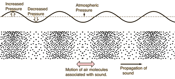 A single-frequency sound wave traveling through air will cause a sinusoidal pressure variation in the air. The air motion which accompanies the passage of the sound wave will be back and forth in the direction of the propagation of the sound, a characteristic of longitudinal waves.