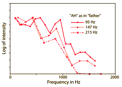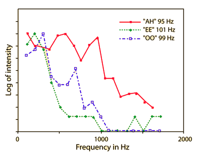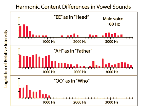 Harmonic Spectrum ExampleIntensity of harmonics as a function of frequency for different vowel sounds produced at the same pitch: