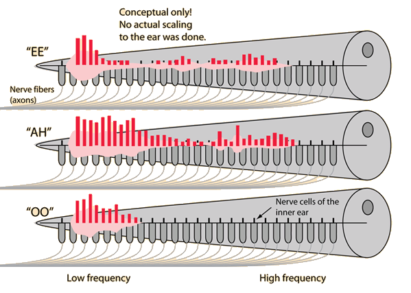 Different vowel sounds, different patterns of excitation in the inner ear.![]() According to the place theory for pitch perception, different frequency sounds excite the basilar membrane of the inner ear in different places. The high frequencies selectively excite the hair cells near the entry point at the oval window and the low frequencies produce maximum response near the smaller end of the tapering membrane. Since the harmonic content of the different vowel sounds is different, the patterns of excitation of the receptor cells are different.