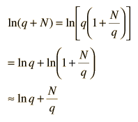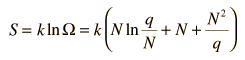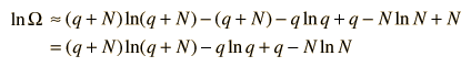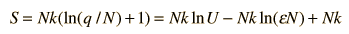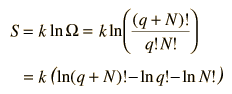 The entropy of the Einstein solid can be expressed in terms of the multiplicity. To make the multiplicity expression manageable, consider the following steps:  The numbers q and N are presumed large and the 1 is dropped. Now making use of Stirling's approximation to evaluate the factorials  Now making the physical assumption that the number of energy units is much larger than the number of oscillators, q>>N, the expression can be further simplified. With rearrangement  Besides making use of log combination rules, the above steps make use of the series expansion of ln(1+N/q) which can be approximated by the first term when q>>N: (approximately, ln(1+x)=x if x<<1). Substitution gives an expression for the entropy of the Einstein solid:  Finally we can make a connection to something akin to a real-world solid. The internal energy U can be represented by q times the oscillator energy unit hf = ε. The last term above will be negligible under the assumption q>>N, so the entropy expression becomes  Using the definition of temperature as a function of entropy gives  This is what is expected from equipartition of energy. Each oscillator has two degrees of freedom, and each should represent kT/2 of energy, giving U=NkT. | Index Entropy concepts Reference Schroeder Ch 2 | ||||||
