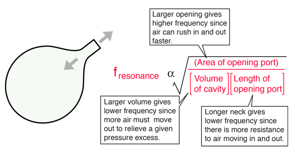 Cavity ResonanceAn air cavity will exhibit a single resonant frequency. If extra air is pushed into the volume and then released, the pressure will drive it out. But, acting somewhat like a mass on a spring which is pulled down and then released, it will overshoot and produce a slight vacuum in the cavity. The air will oscillate into and out of the container for a few cycles at a natural frequency. The qualitative nature of the frequency determining factors: ![]() Actually the frequency depends upon the square root of these factors and also upon the speed of sound, as you can see in the actual calculation of the frequency. But the above illustration shows the physical factors that are involved in determining the resonant frequency.