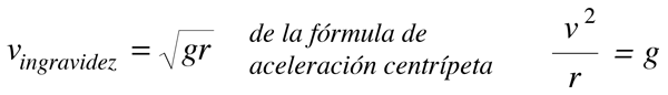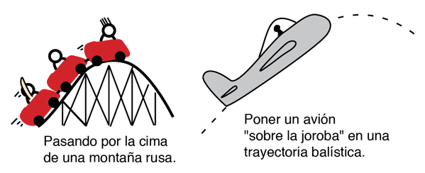 Sensación de "flotar" cuando va "sobre la joroba"![]() El fenómeno de "ingravidez" ocurre cuando no hay fuerza que soporte su cuerpo. Cuando su cuerpo está efectivamente en "caida libre" acelerando hacia abajo a la tasa de la aceleración de la gravedad, es cuando Ud. no está siendo soportado. La sensación de peso aparente, viene del soporte que sentimos del suelo, de la silla, etc. Tanto en una montaña rusa como en un aeroplano, pueden ocurrir diferentes sensaciones de peso aparente, porque ambos pueden acelerar tanto hacia arriba como hacia abajo. Cuando Ud. viaja en un camino curvo sobre el plano vertical y llega a la cima de ese camino, se produce necesariamente una aceleración hacia abajo. Tomando el ejemplo de la montaña rusa, que fuerza al vehículo a caminar sobre unos carriles fijos, entonces la condición de flotar, se alcanza cuando la aceleración hacia abajo de su asiento es igual a la aceleración de la gravedad. Consideremos una parte del camino de la montaña rusa como un segmento de un círculo, de modo que se pueda relacionar la aceleración centrípeta, (aceleración del vehículo), con la aceleración de la gravedad. La condición de ingravidez será ![]() La "ingravidez" que se puede sentir sobre un aeroplano, ocurre siempre que el mismo esté acelerando hacia abajo con el valor de 1g. Es posible experimentar ingravidez durante una considerable lapso de tiempo apuntando el morro del aparato hacia arriba y cortandole la energía de modo que viaje en una trayectoria balística. Una trayectoria balística es un tipo comun de trayectoria que se consigue tirando una piedra o una pelota, sin considerar la fricción del aire. En cualquier punto de la trayectoria la aceleración es igual a g hacia abajo puesto que no hay soporte. Se han efectuado una considerable cantidad de experimentos con esas trayectorias balísticas, para practicar en misiones orbitales, donde todo el tiempo se experimenta la ingravidez.