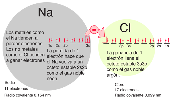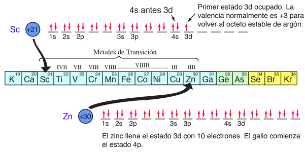 El llenado del orbital 2p coloca ocho electrones en la segunda capa, un "octeto estable". Esta configuración particularmente estable produce el gas noble neón. Pero el flúor con uno menos que un octeto estable es ¡muy activo!. Tiende a ganar un electrón, mientras que el sodio muy activo tiende a perder un electrón, produciéndose en cada caso la configuración del octeto estable del neón. Las configuraciones orbitales de electrones proporcionan una estructura para comprender las reacciones químicas, que se guían por el principio de la búsqueda de la configuración de electrones con la energía más baja (más estable). Decimos que el sodio tiene una valencia de 1, porque tiene tendencia a perder un electrón, y el cloro tiene una valencia de -1, porque tiene tendencia a ganar un electrón. Ambos átomos son muy activos químicamente, y su combinación es el caso clásico de enlace iónico. ![]() Los compuestos químicos que contienen elementos de las tres primeras filas de la tabla periódica, pueden ser bien entendidos con el tipo de consideraciones orbitales de más arriba. Las cosas se vuelven más complicadas en la cuarta fila de la tabla periódica. Los electrones 4s descienden en energía por debajo de los electrones 3d, y puesto que hay diez posibles combinaciones de números cuánticos en la sub-capa d, esto inserta 10 elementos entre los subniveles 4s y 4p, los llamados "elementos de transición". ![]()